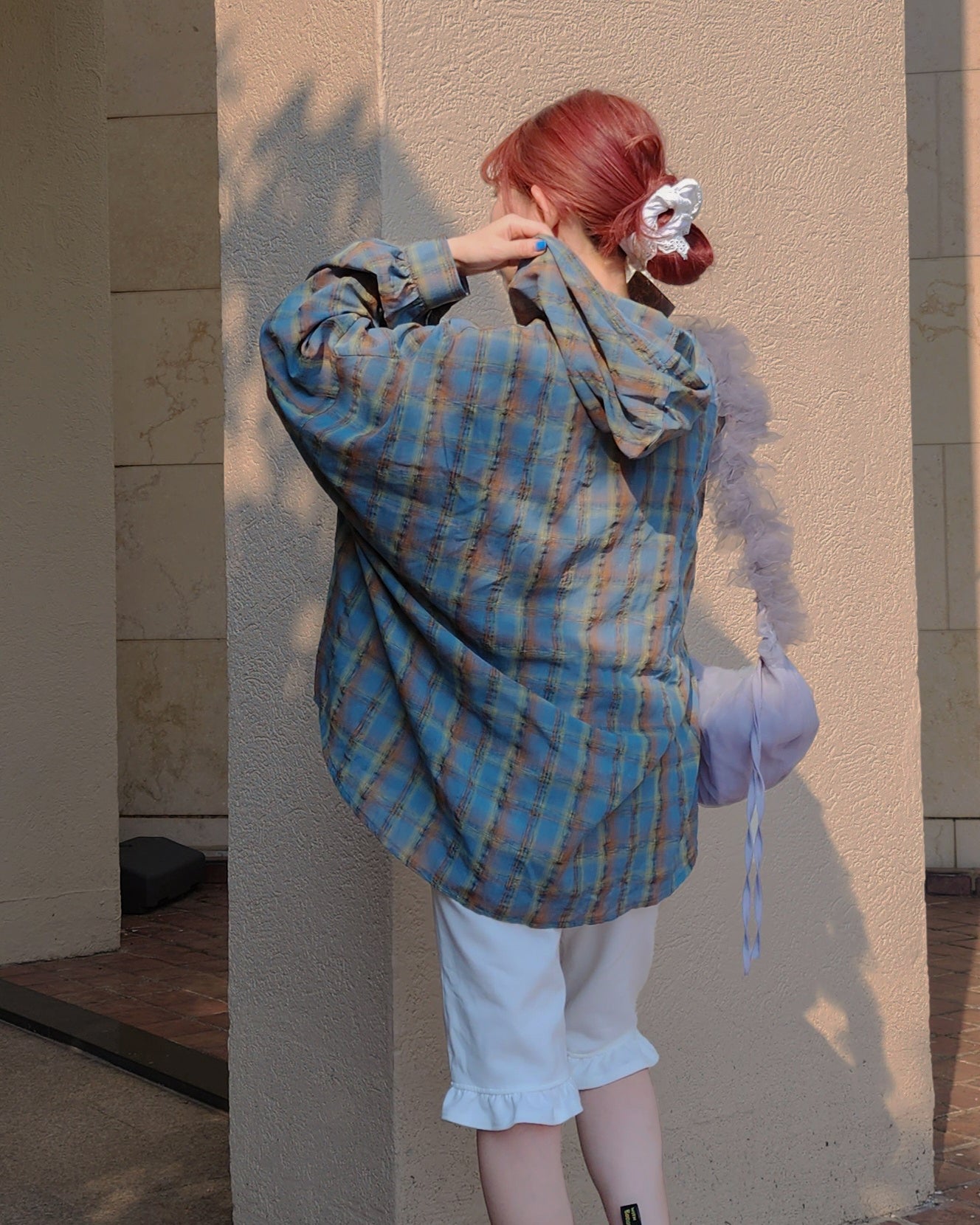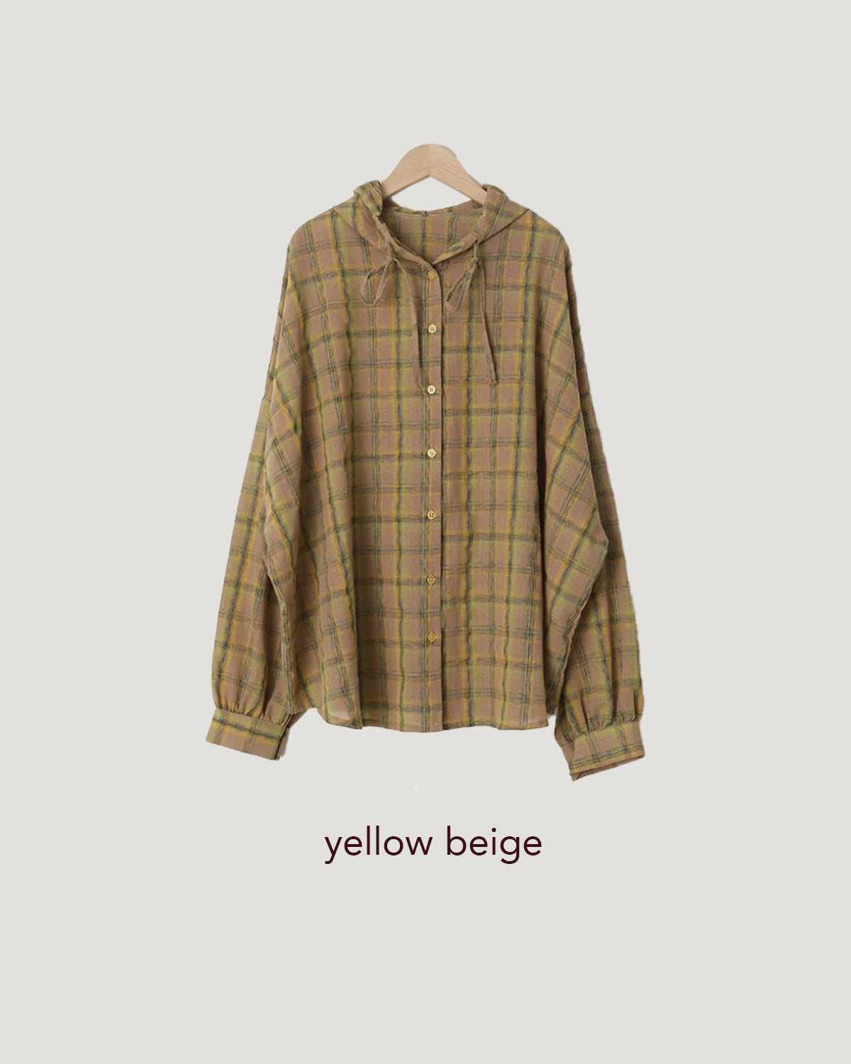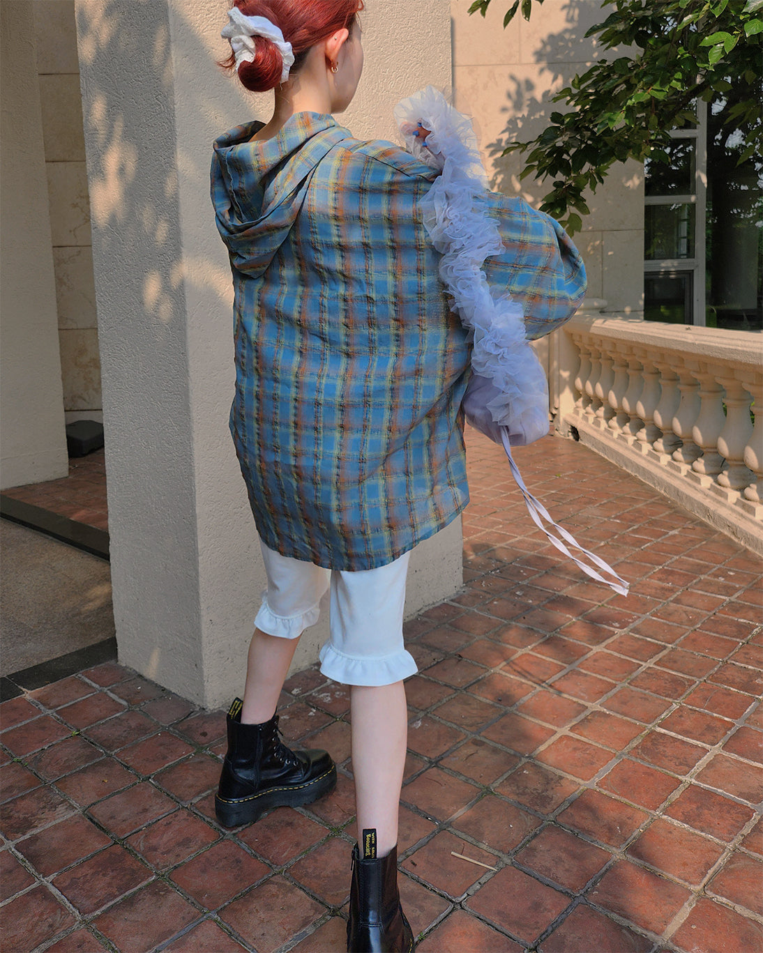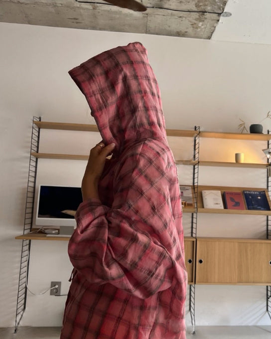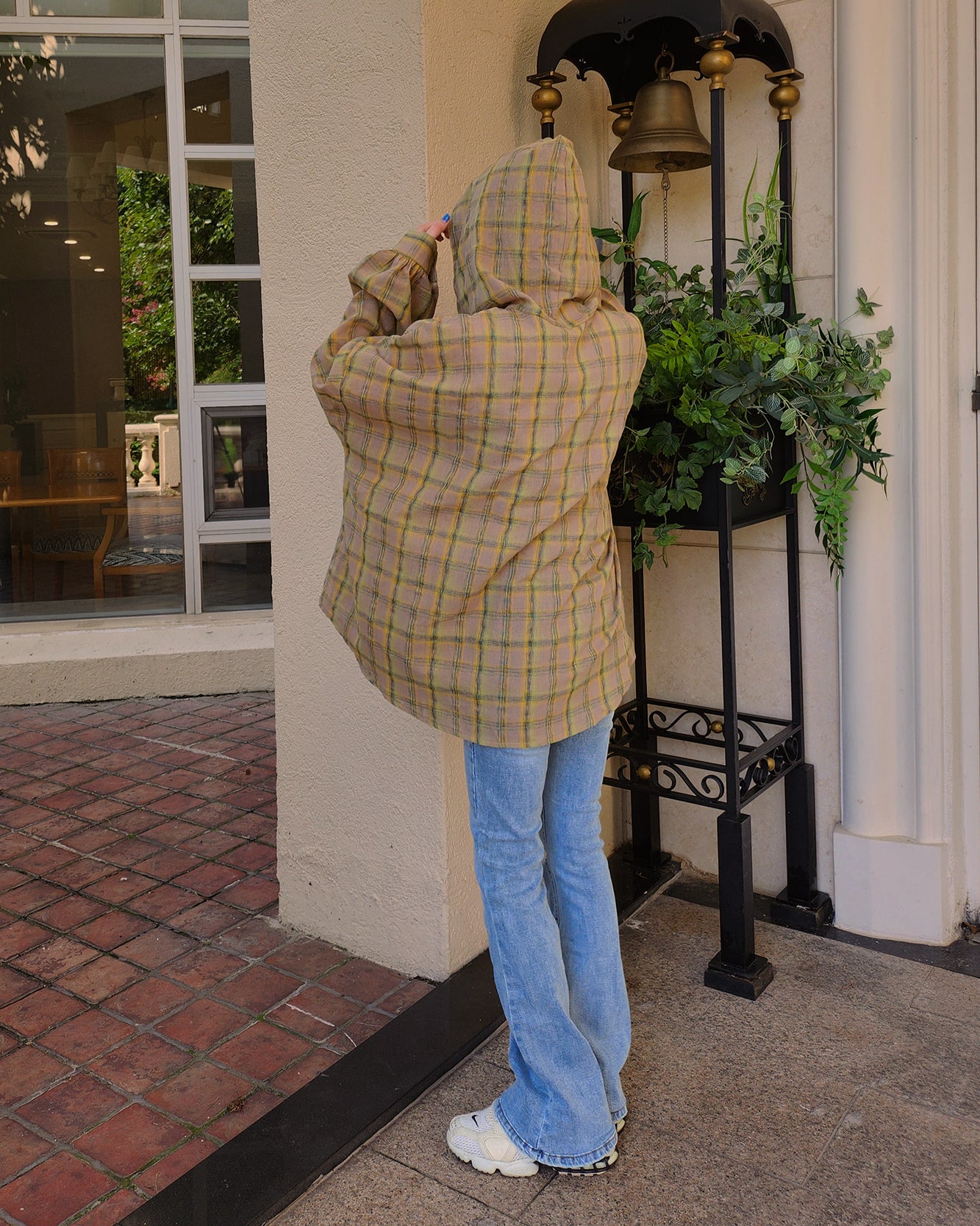 カジュアルでスタイリッシュなチェックフードシャツ。