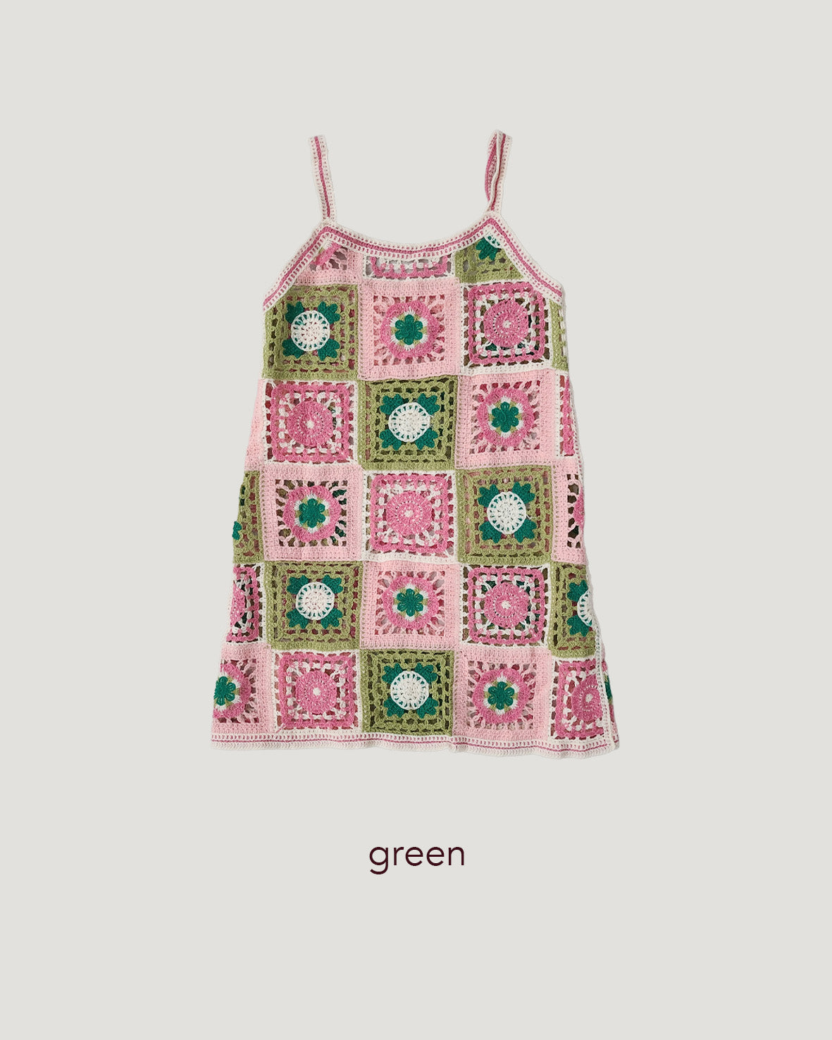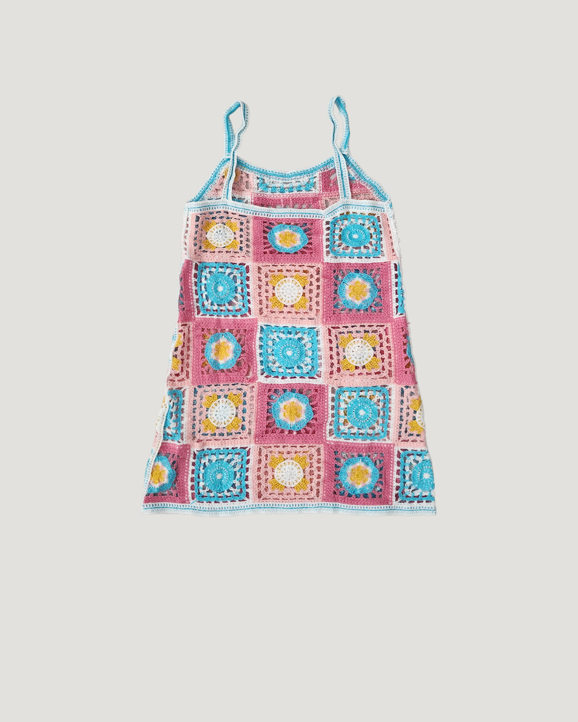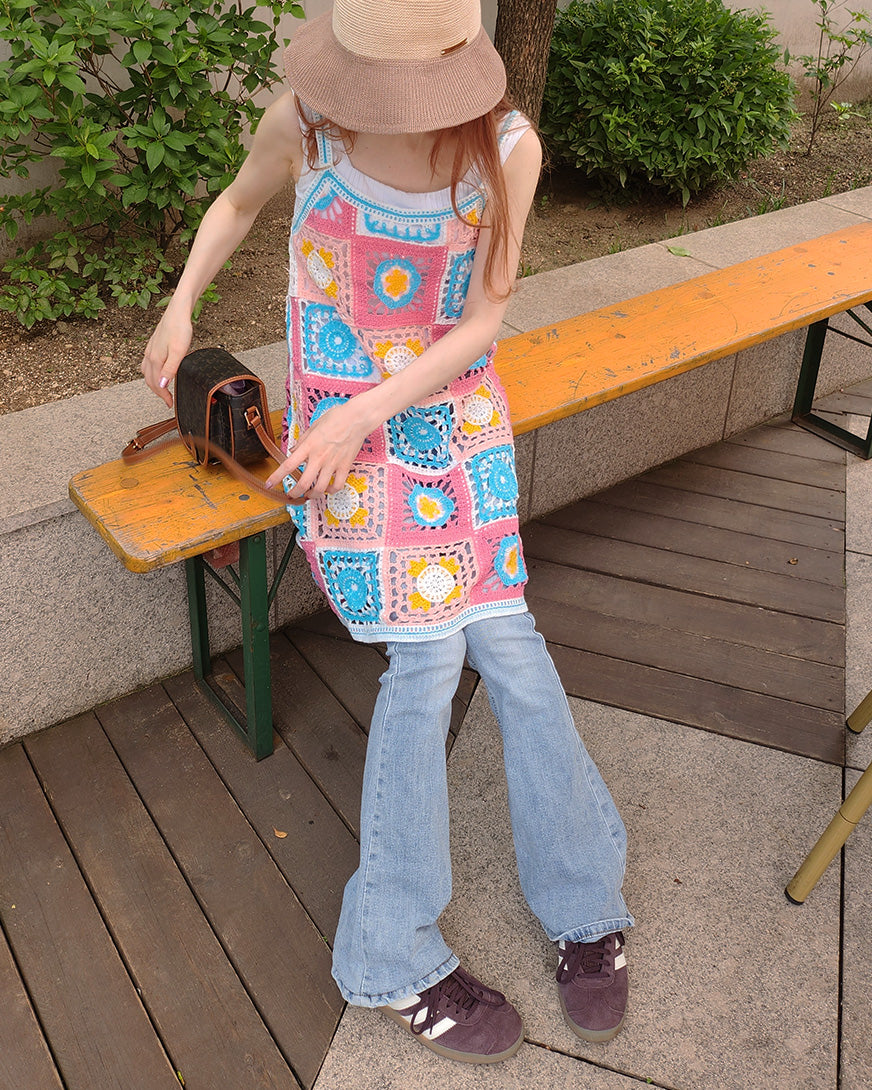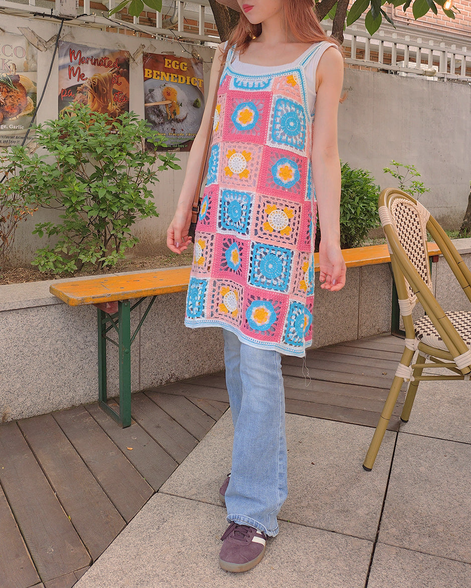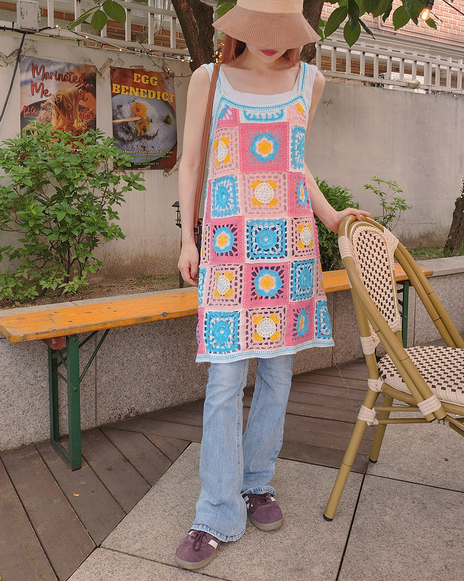 目を引くカラフルなフラワーモチーフが特徴のクロシェ編みニットワンピース。