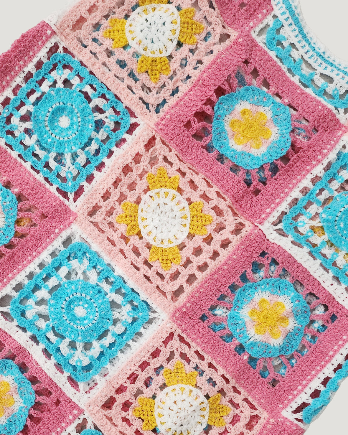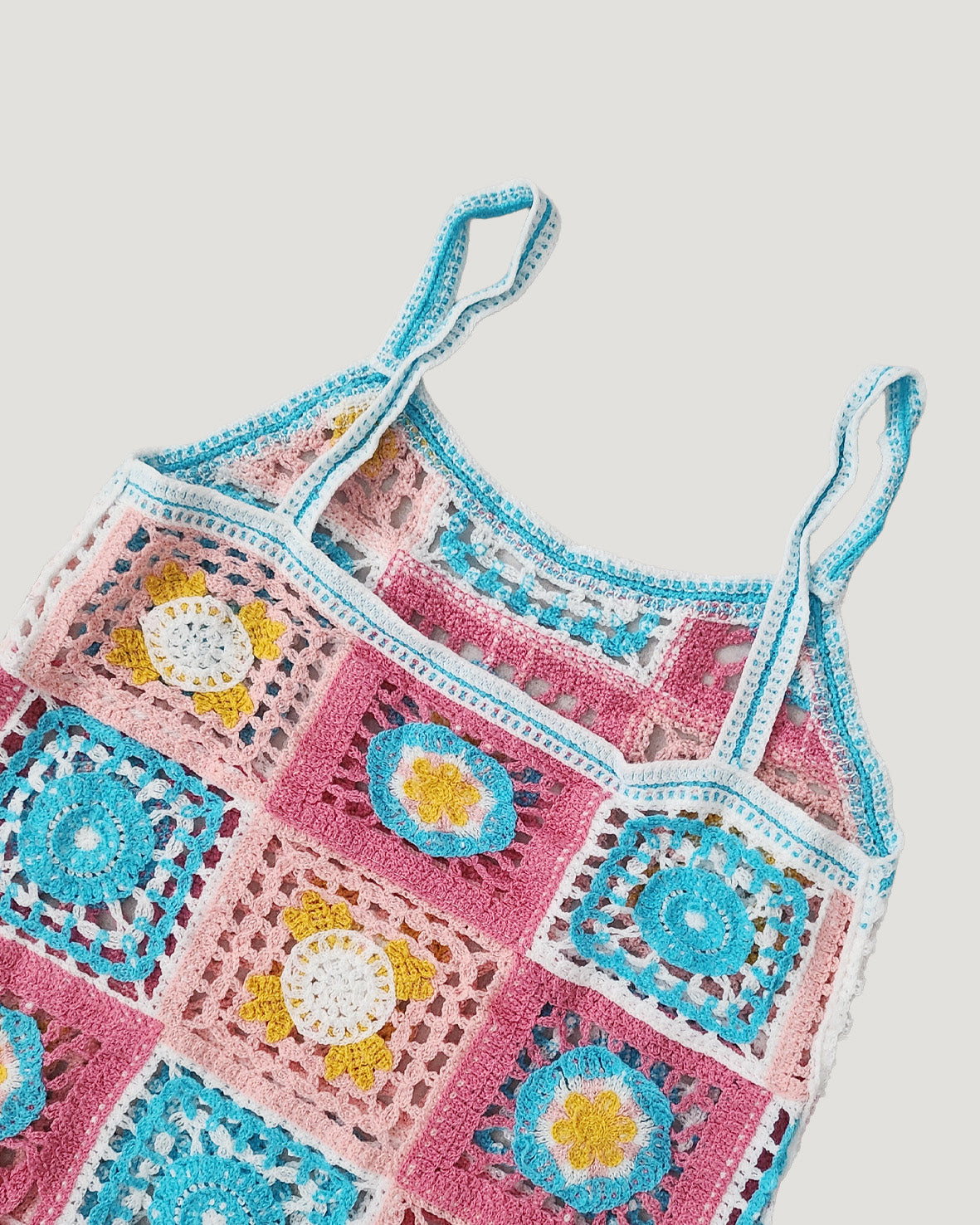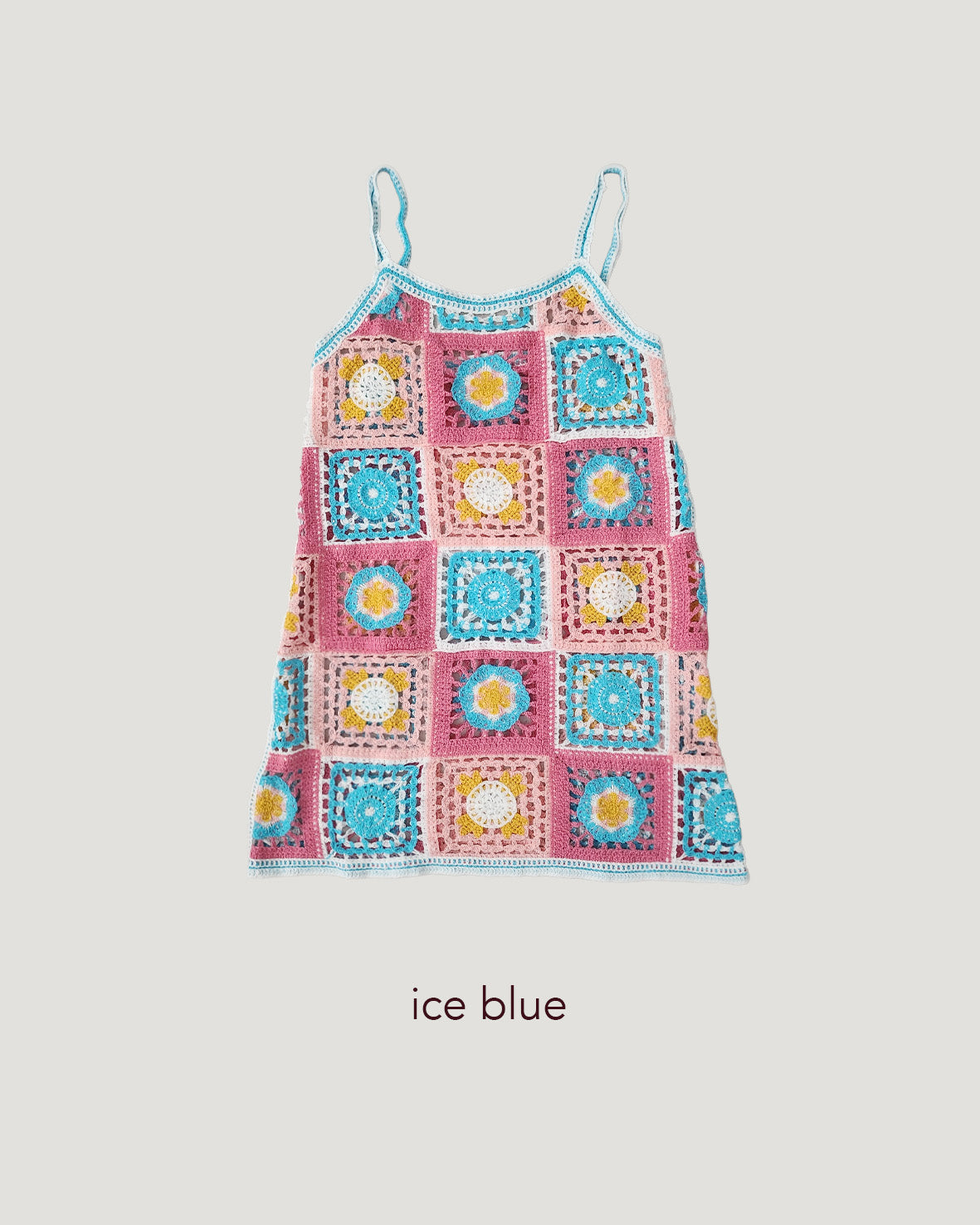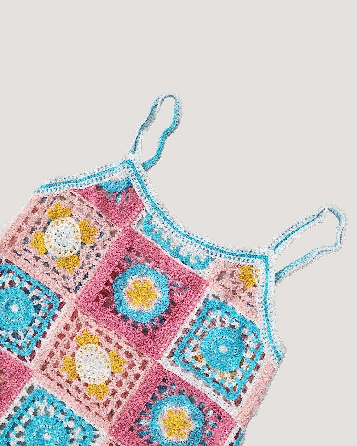 目を引くカラフルなフラワーモチーフが特徴のクロシェ編みニットワンピース。