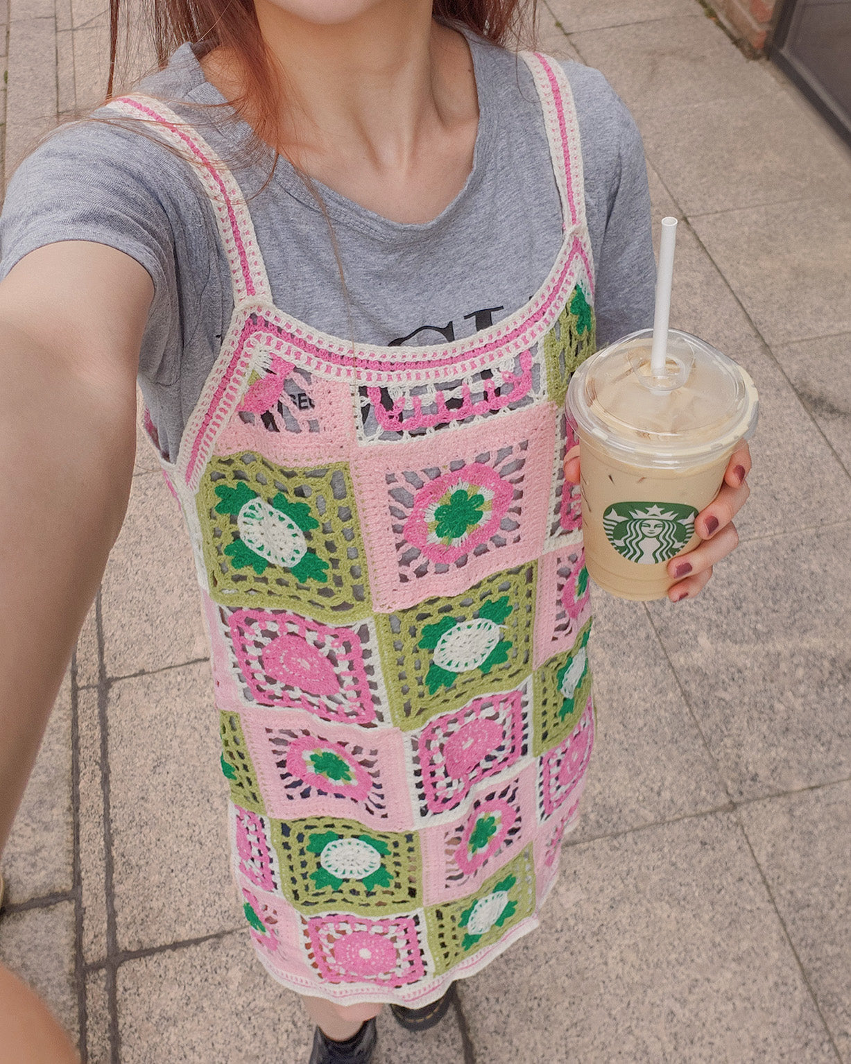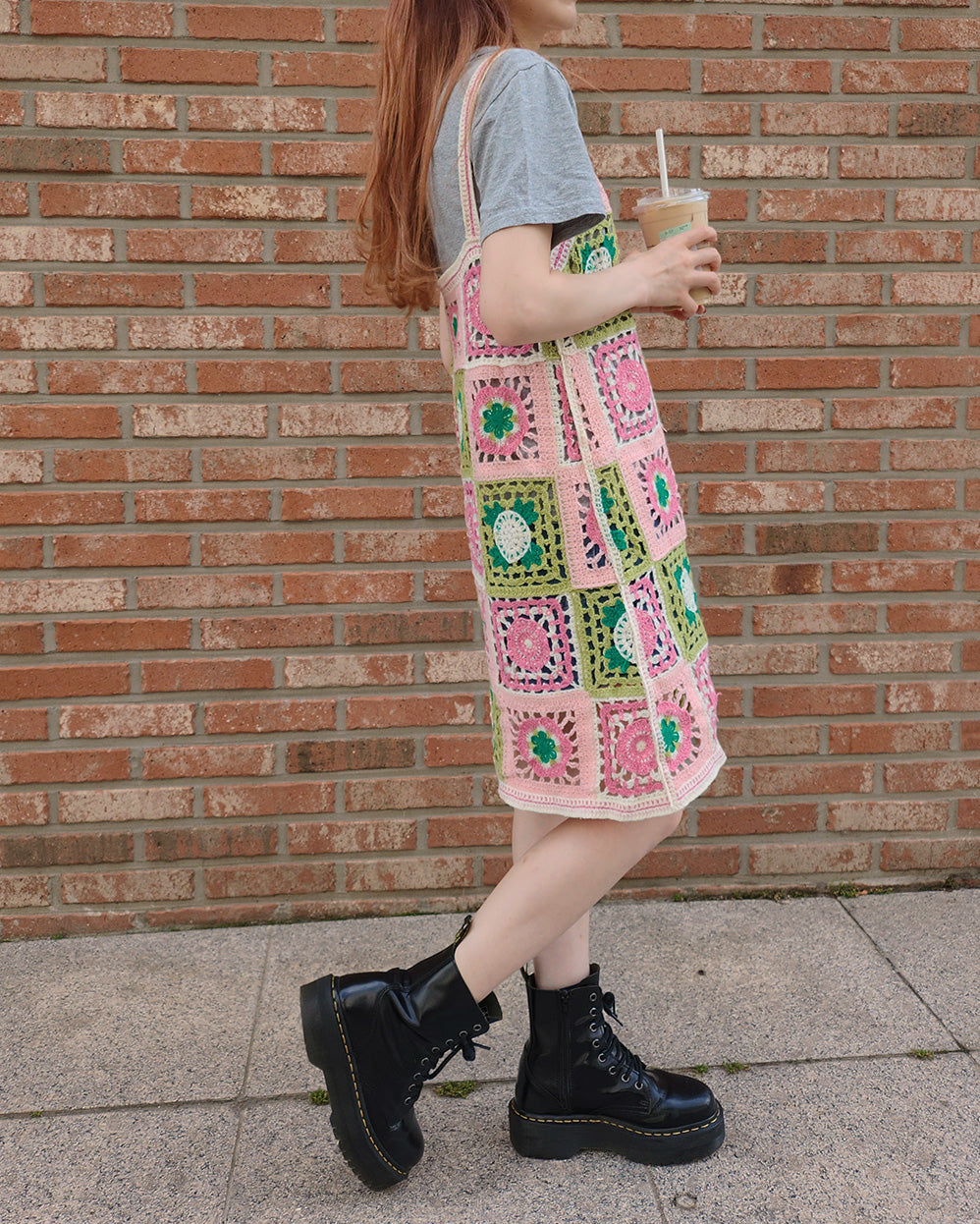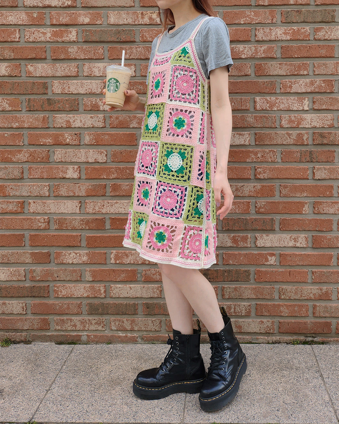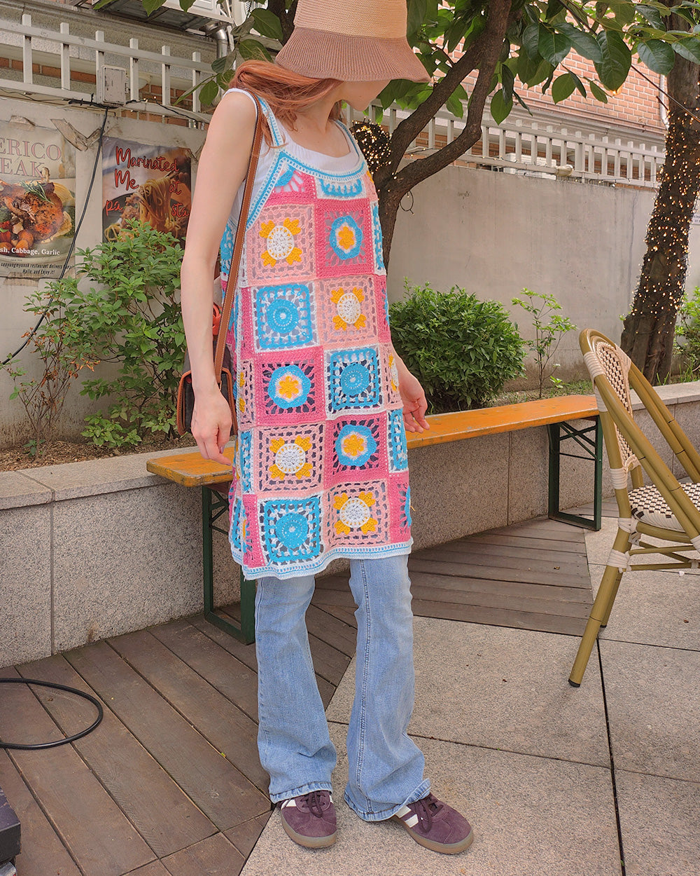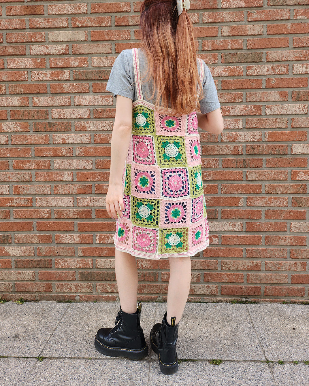 目を引くカラフルなフラワーモチーフが特徴のクロシェ編みニットワンピース。