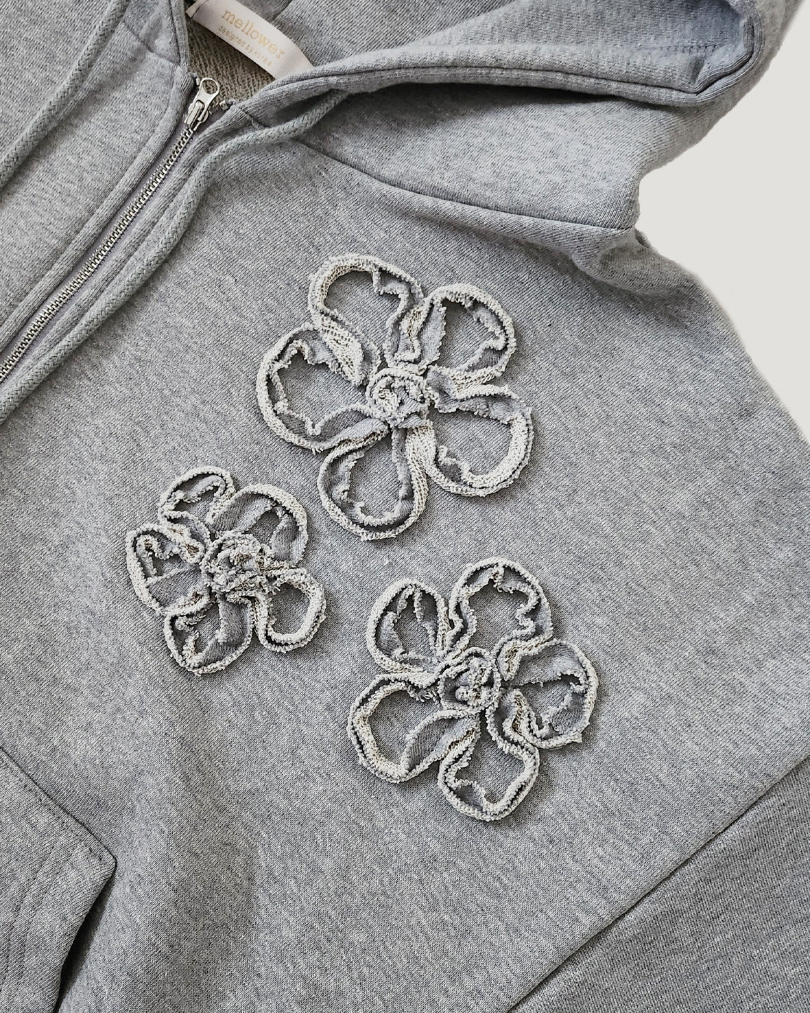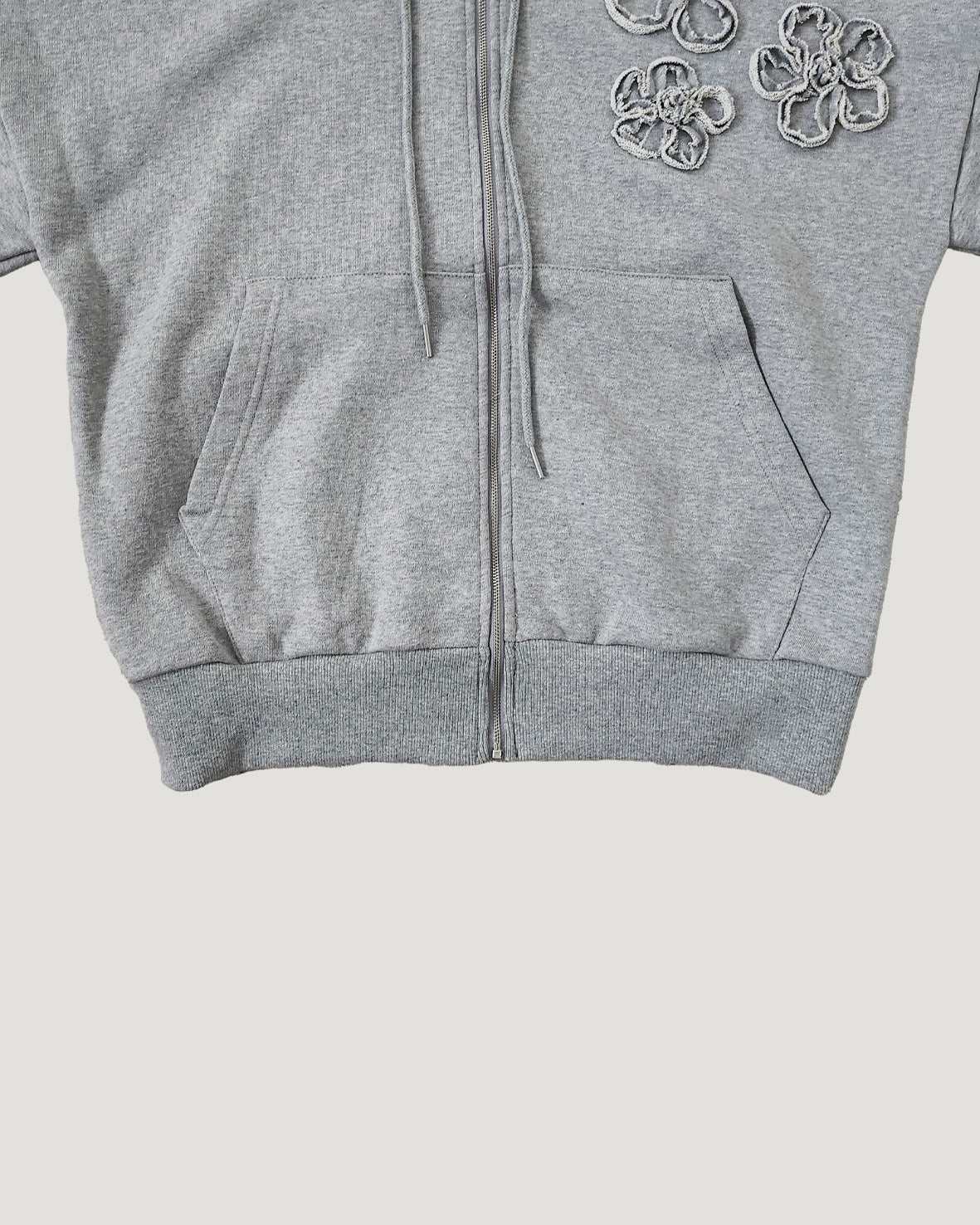 同生地で施したフラワーモチーフがポイントのジップアップパーカー。