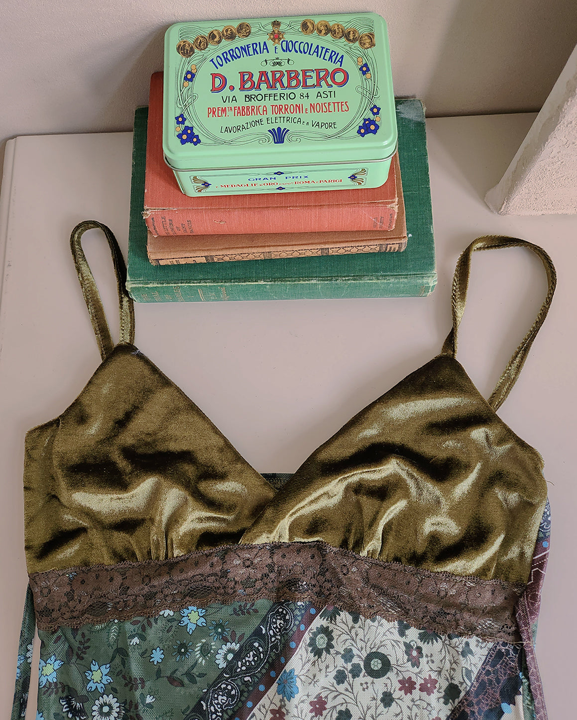 ベロア素材とシアー感のあるフラワー柄の切り替えが特徴的なキャミソール。