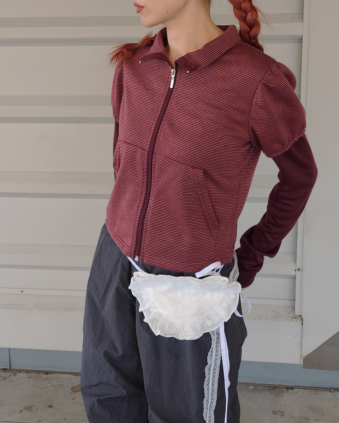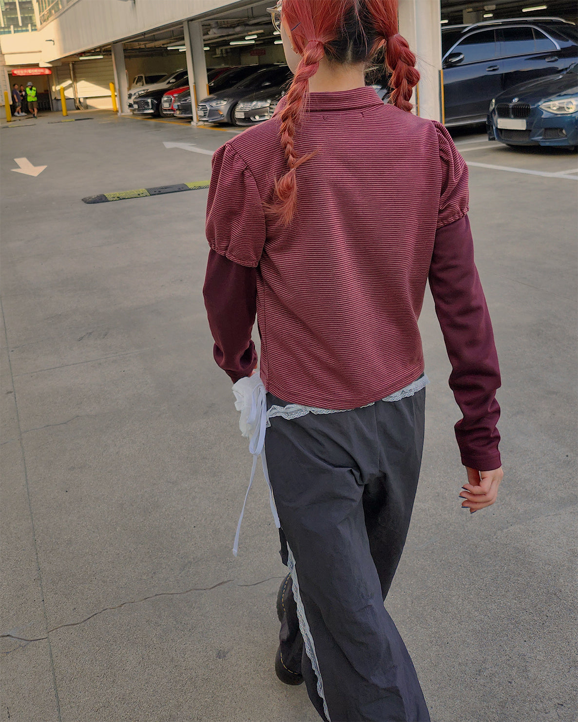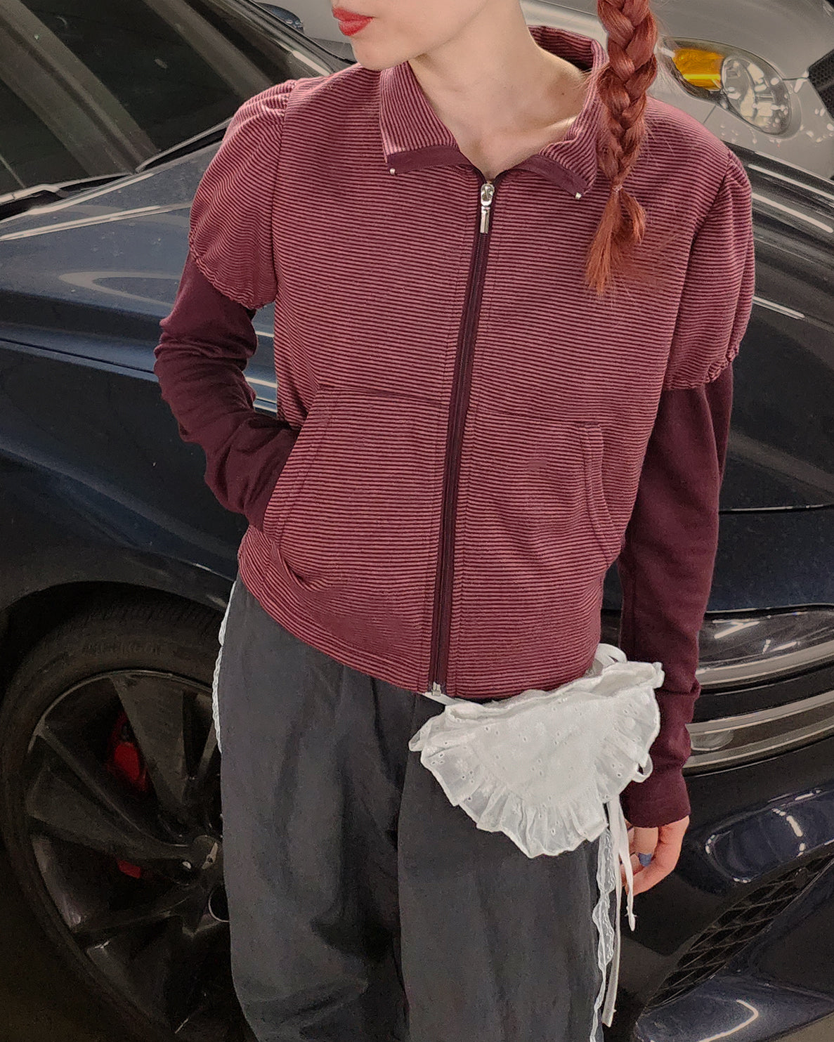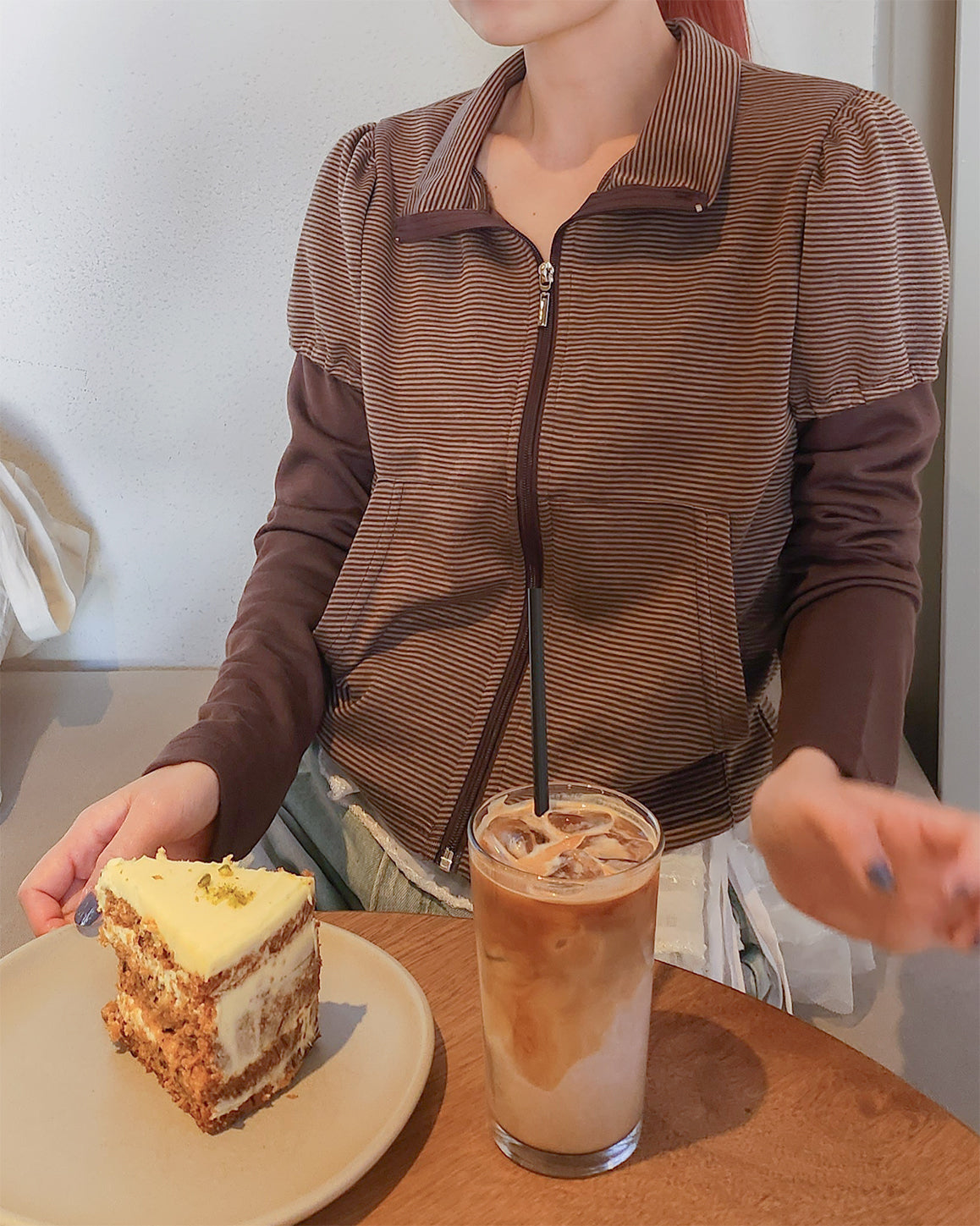 くすみカラーのストライプ柄とパフュームスリーブがポイント。