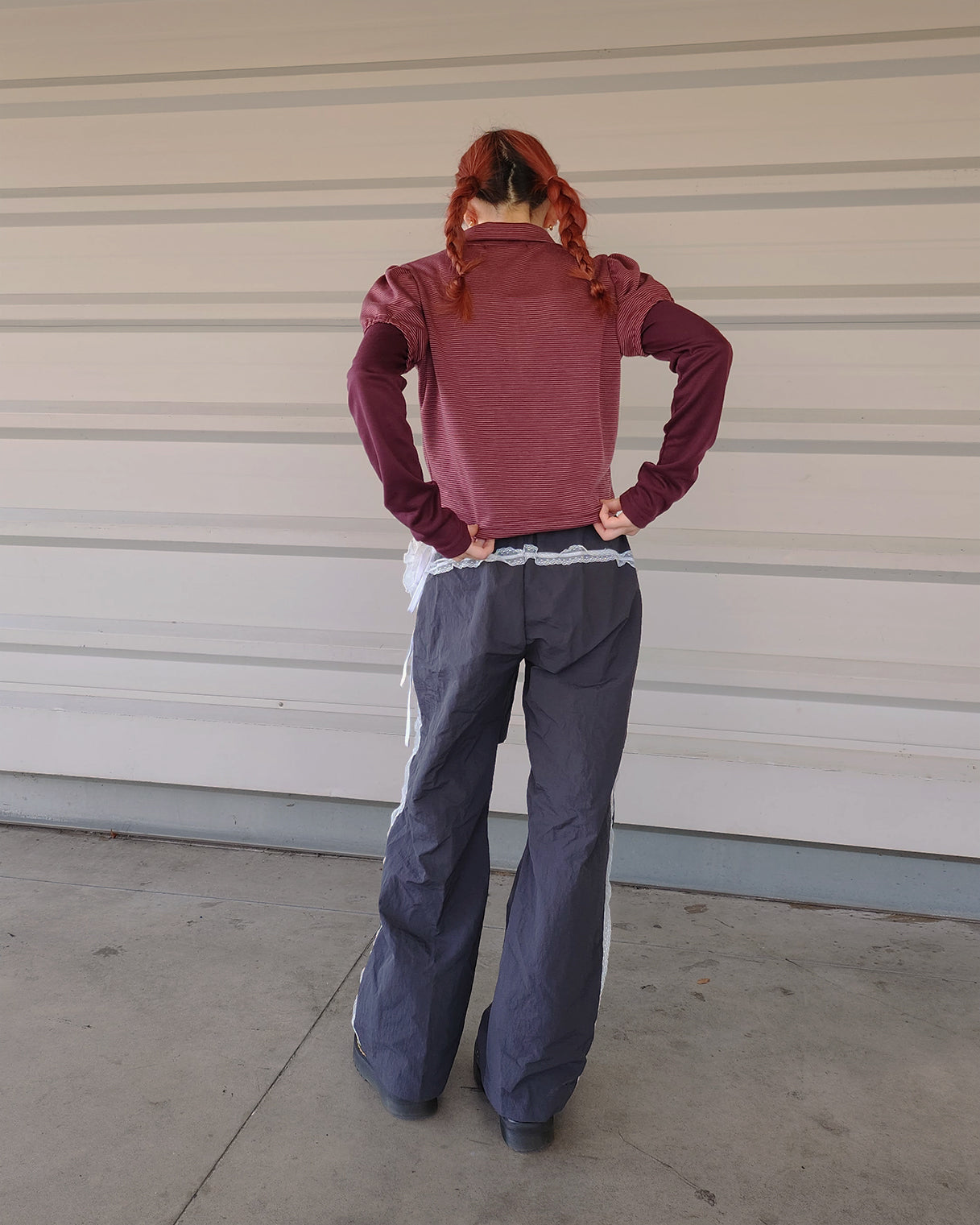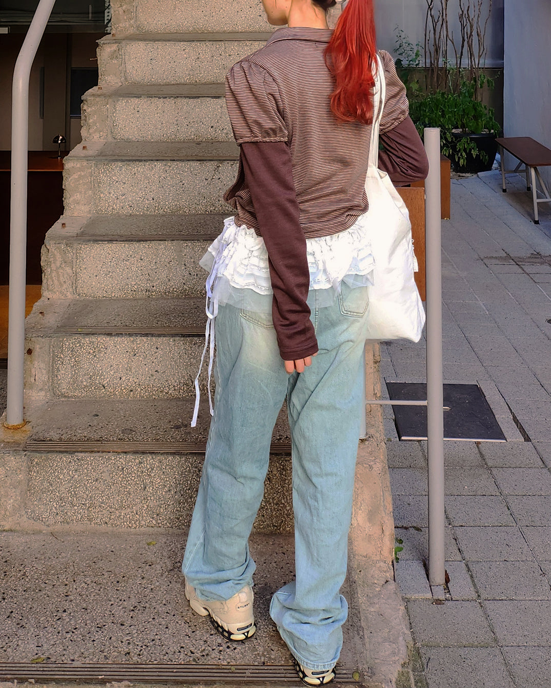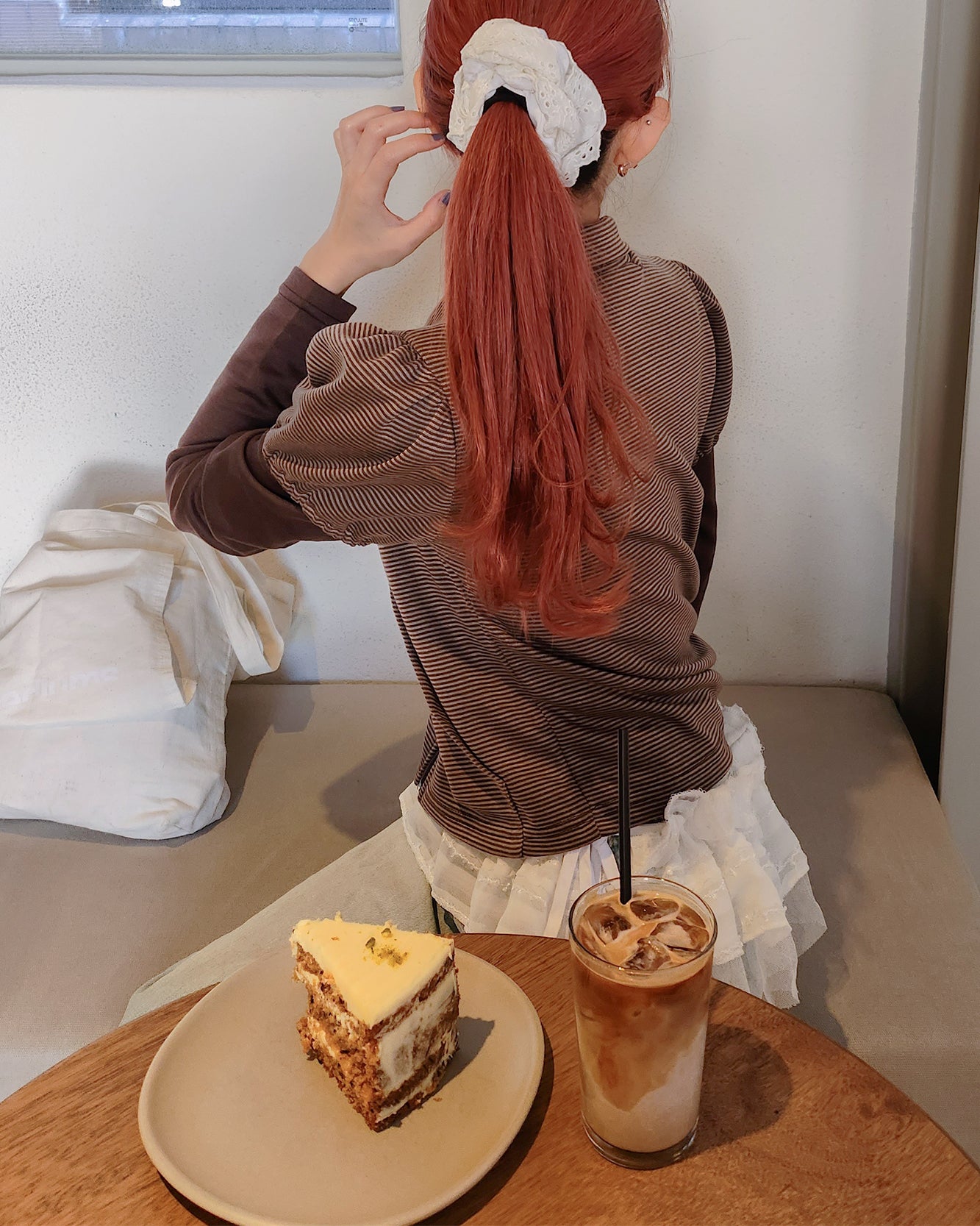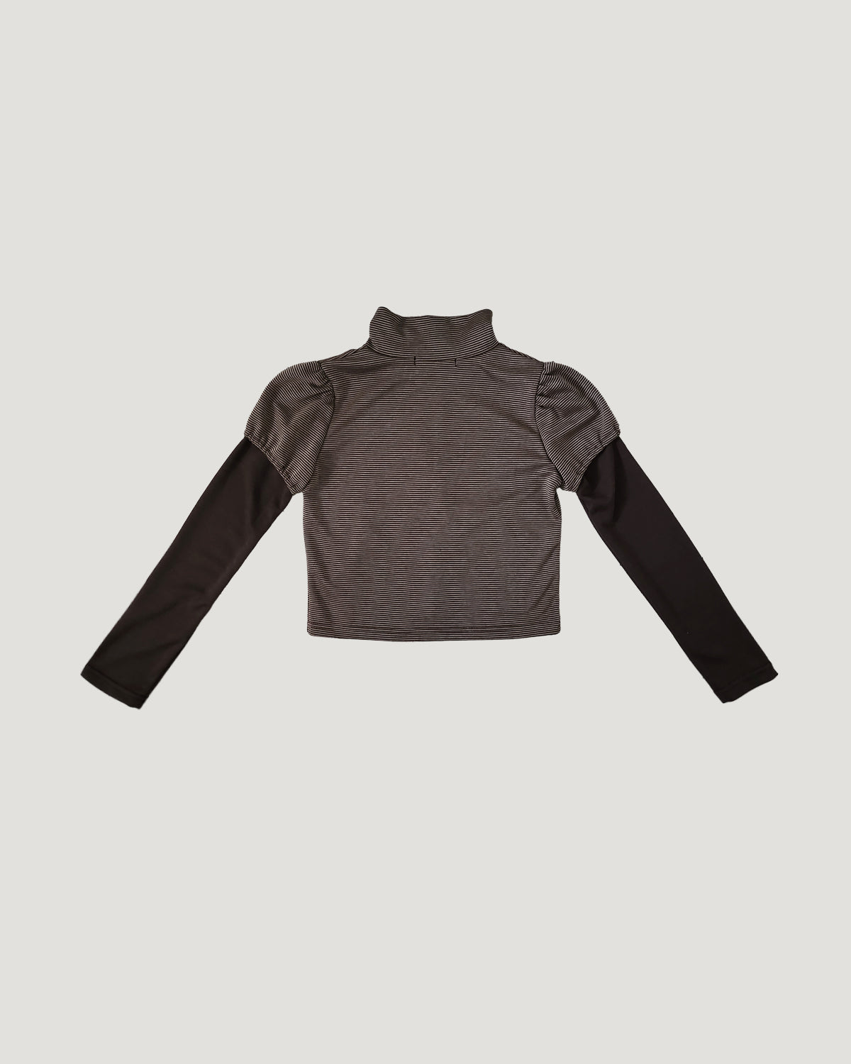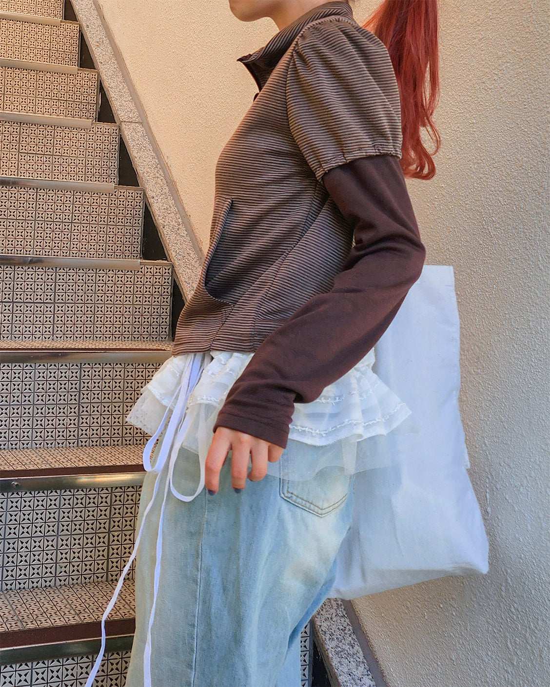 くすみカラーのストライプ柄とパフュームスリーブがポイント。
