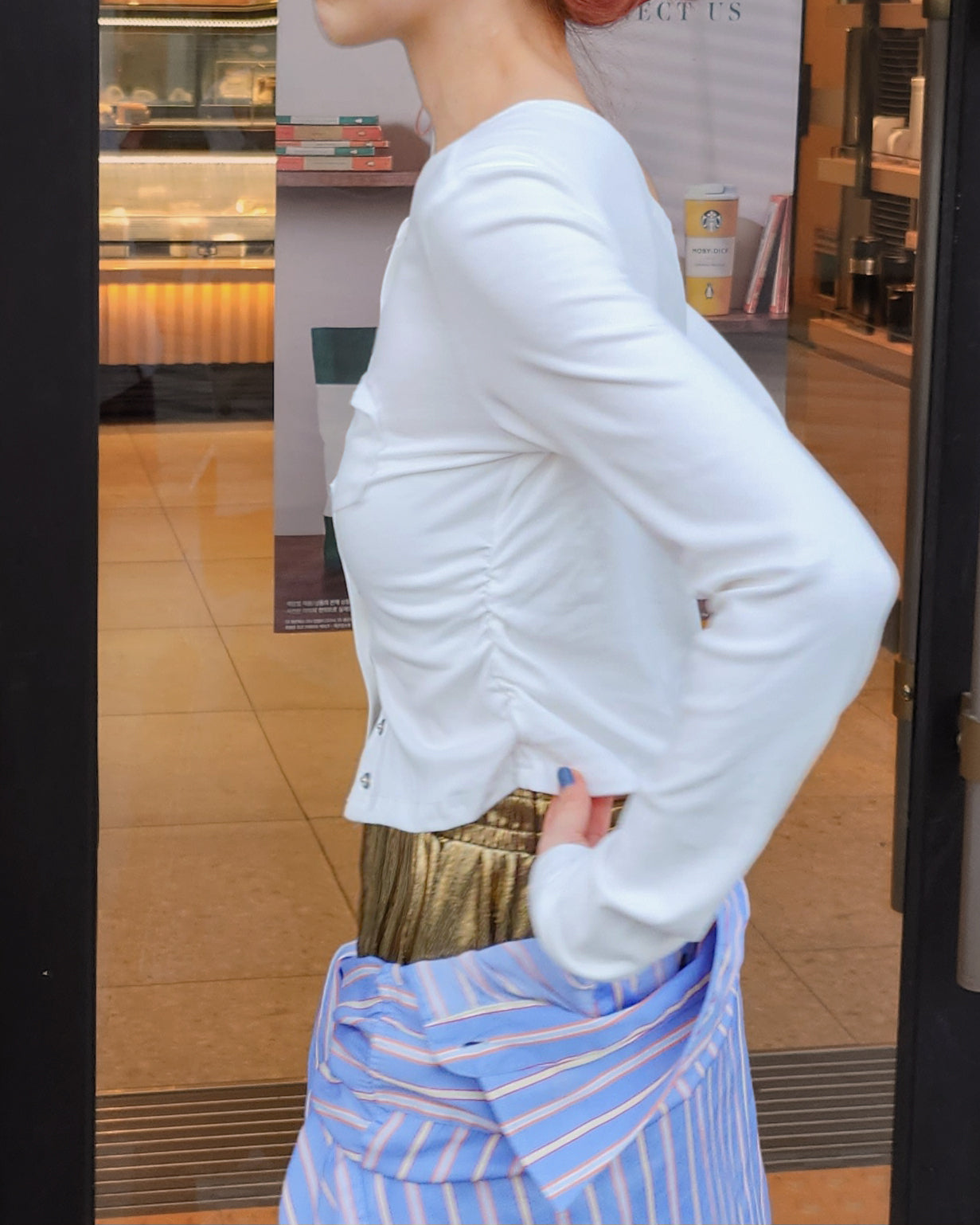 ワンショルダーの薄手の長袖トップス。