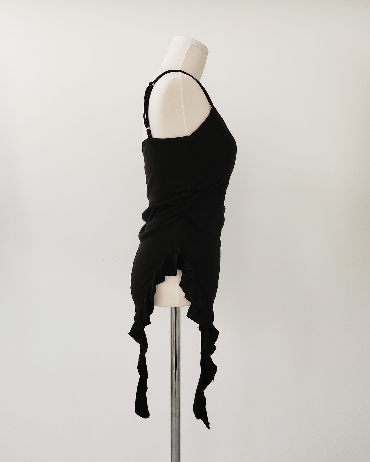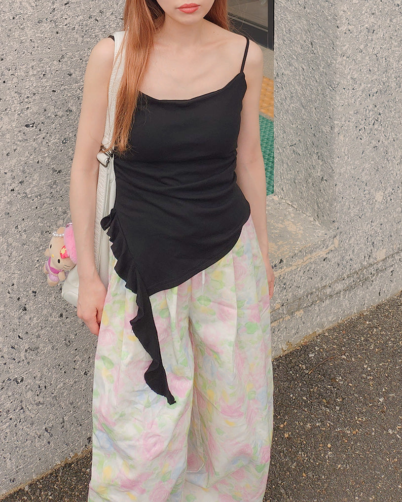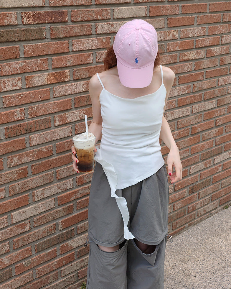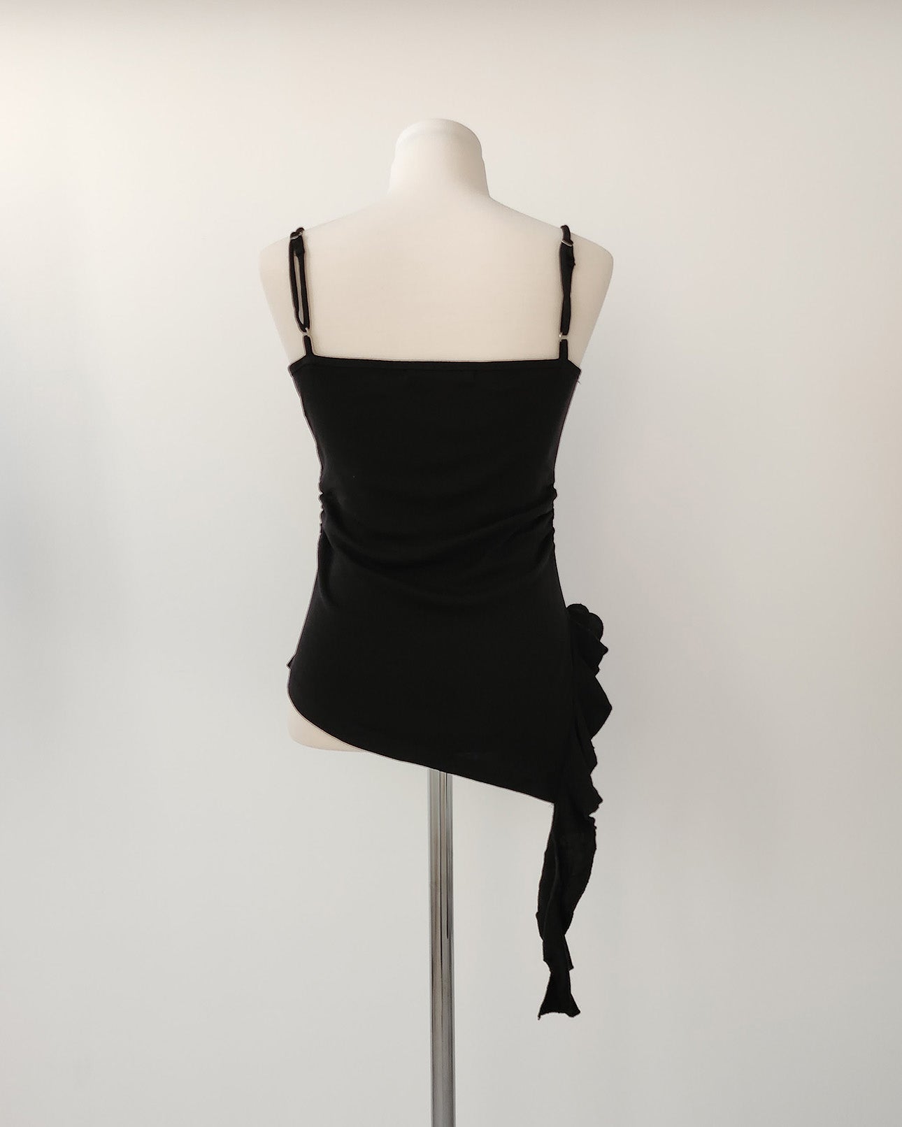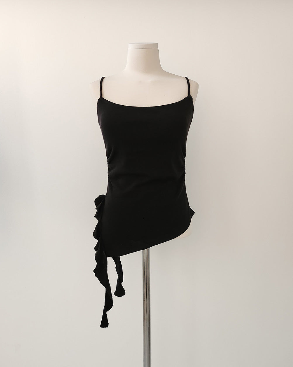 アシンメトリーな裾とフリルが特徴のキャミソール。