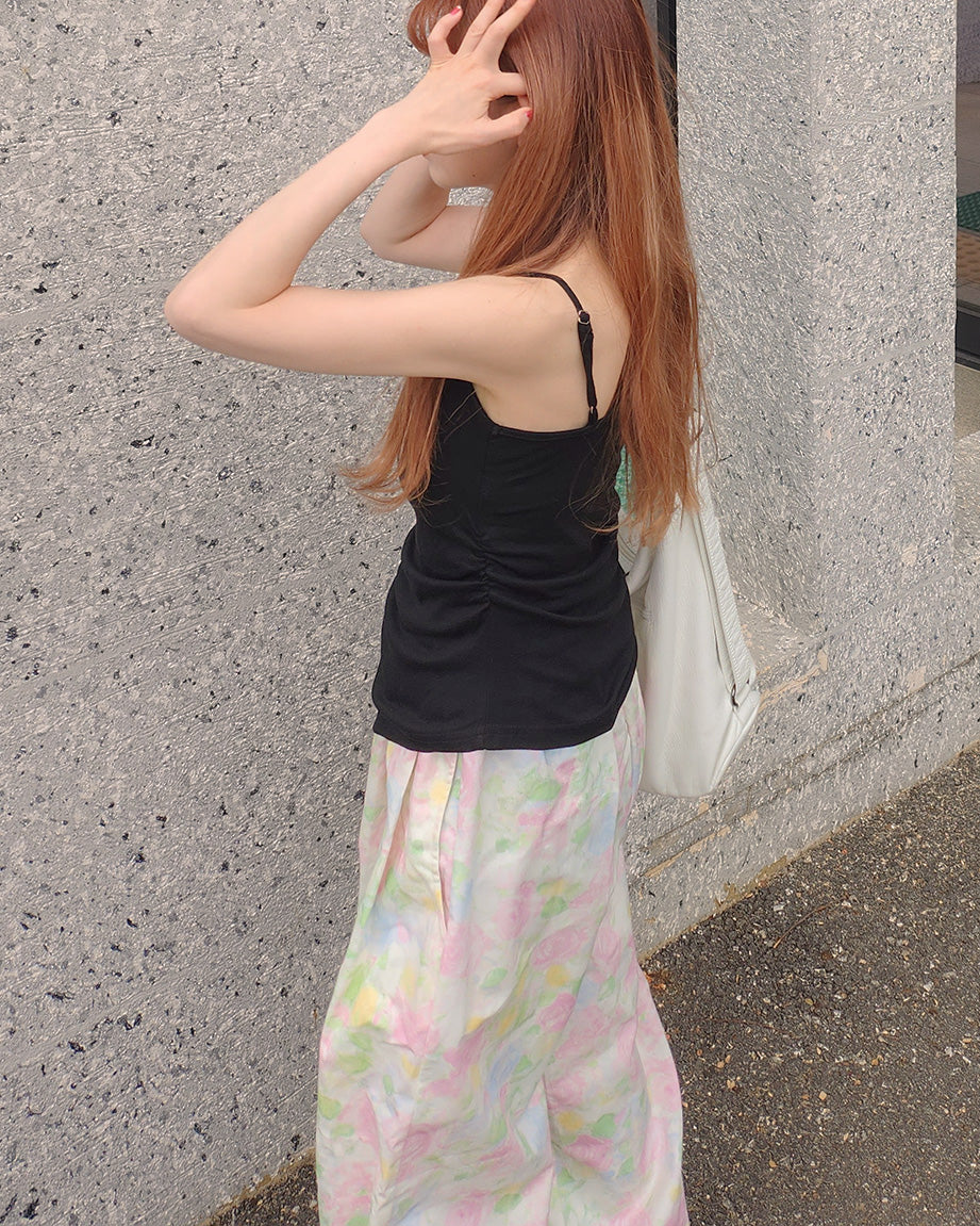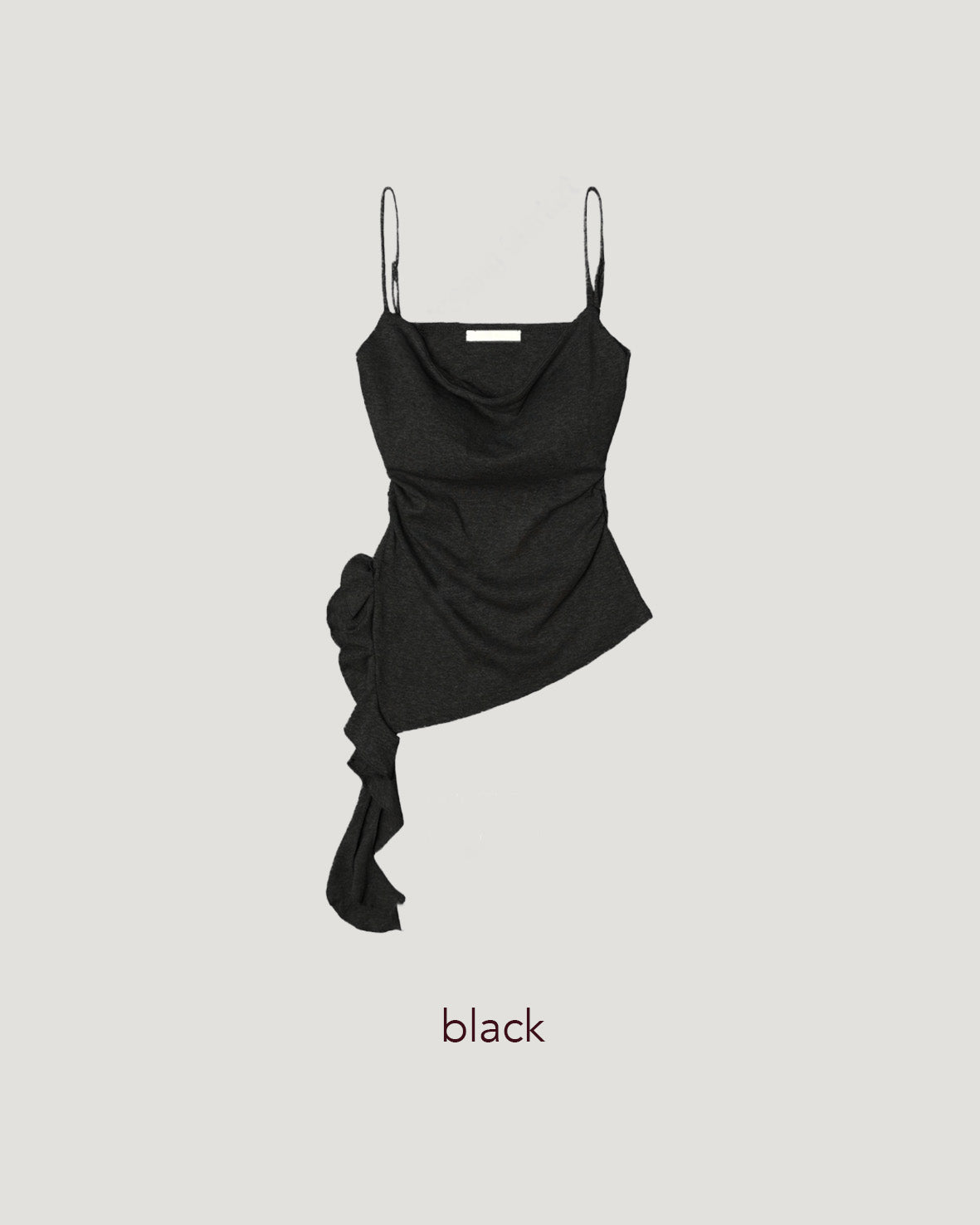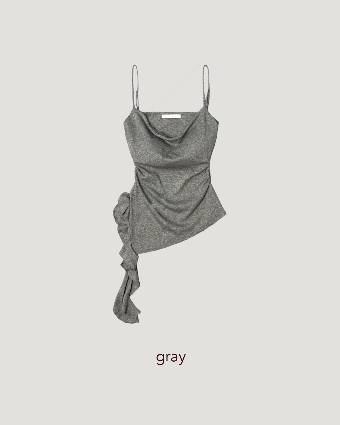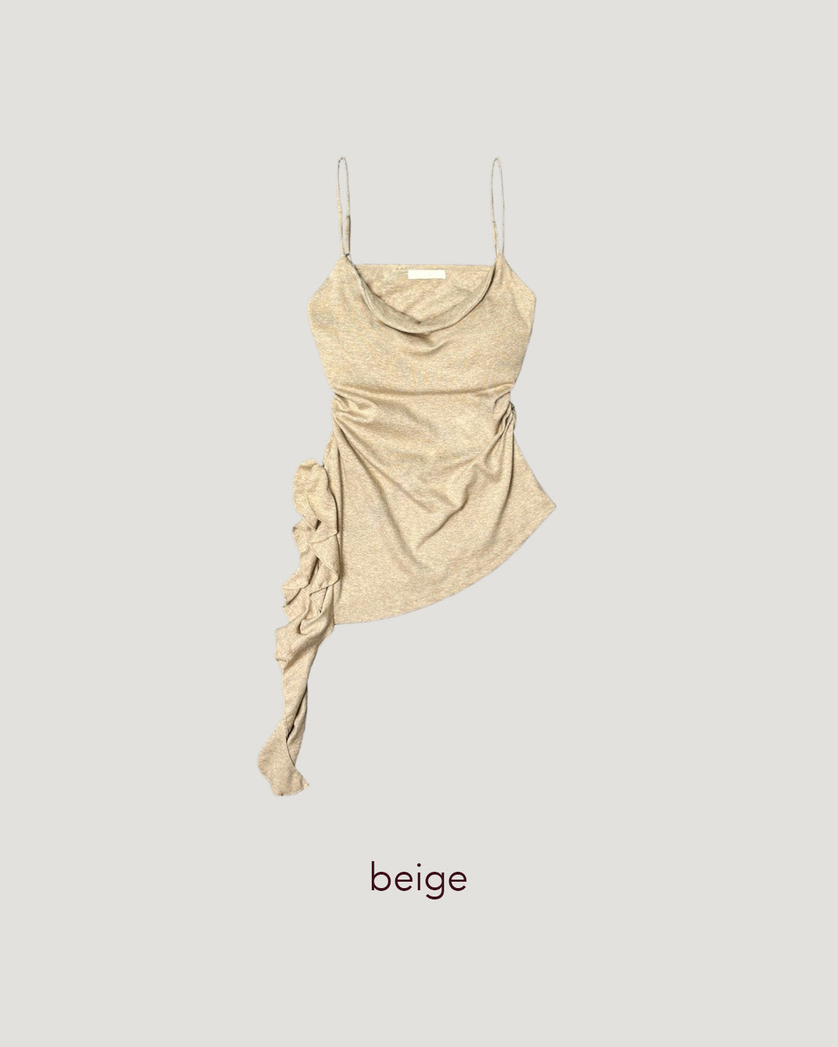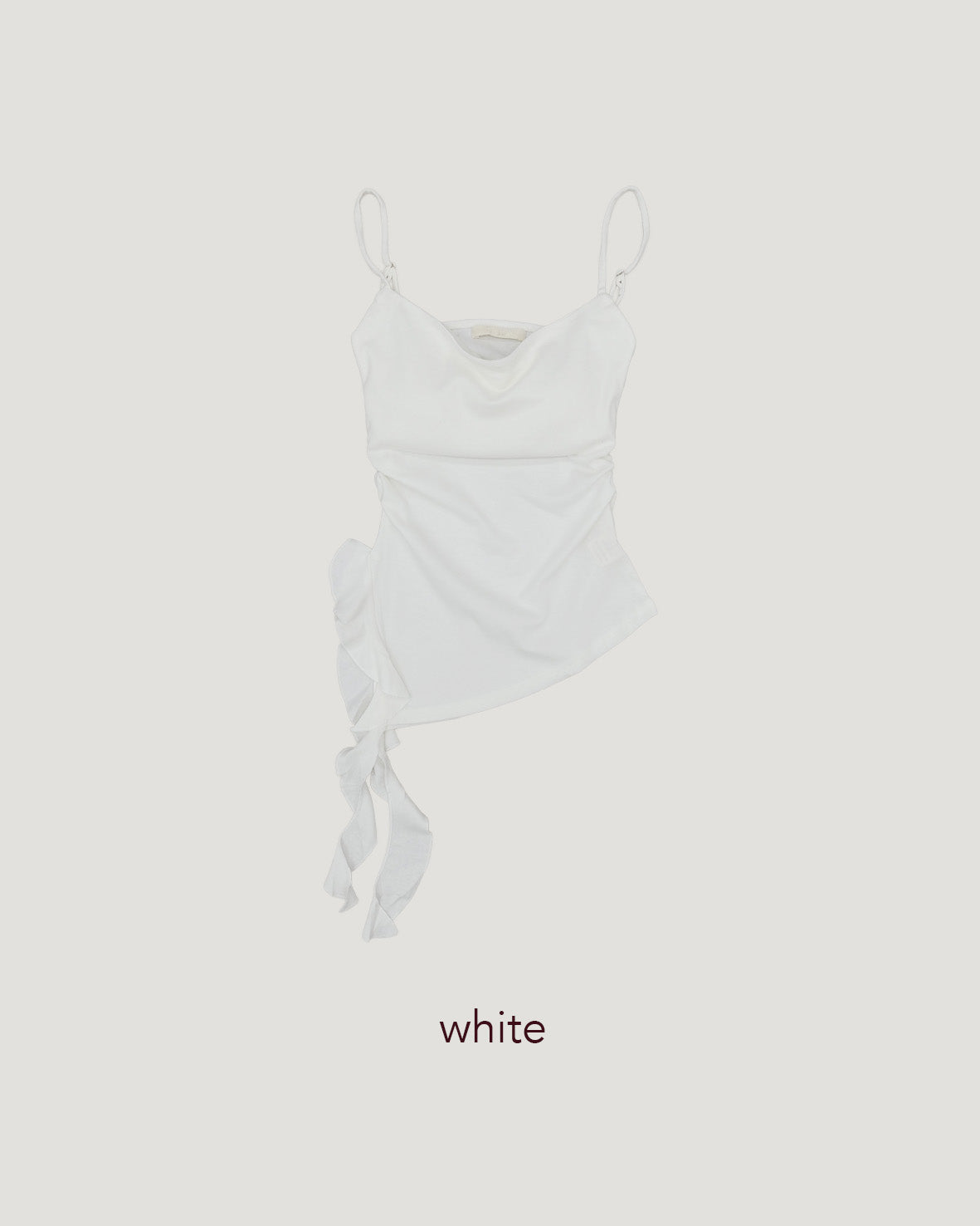 アシンメトリーな裾とフリルが特徴のキャミソール。