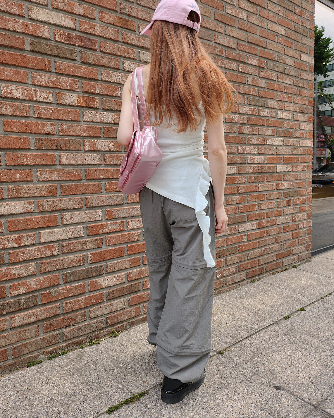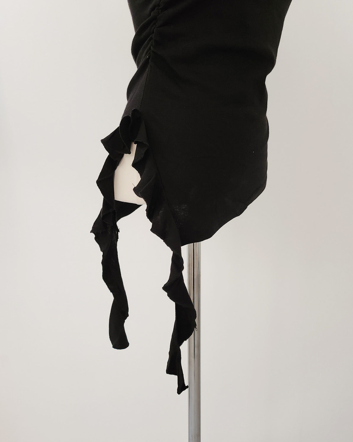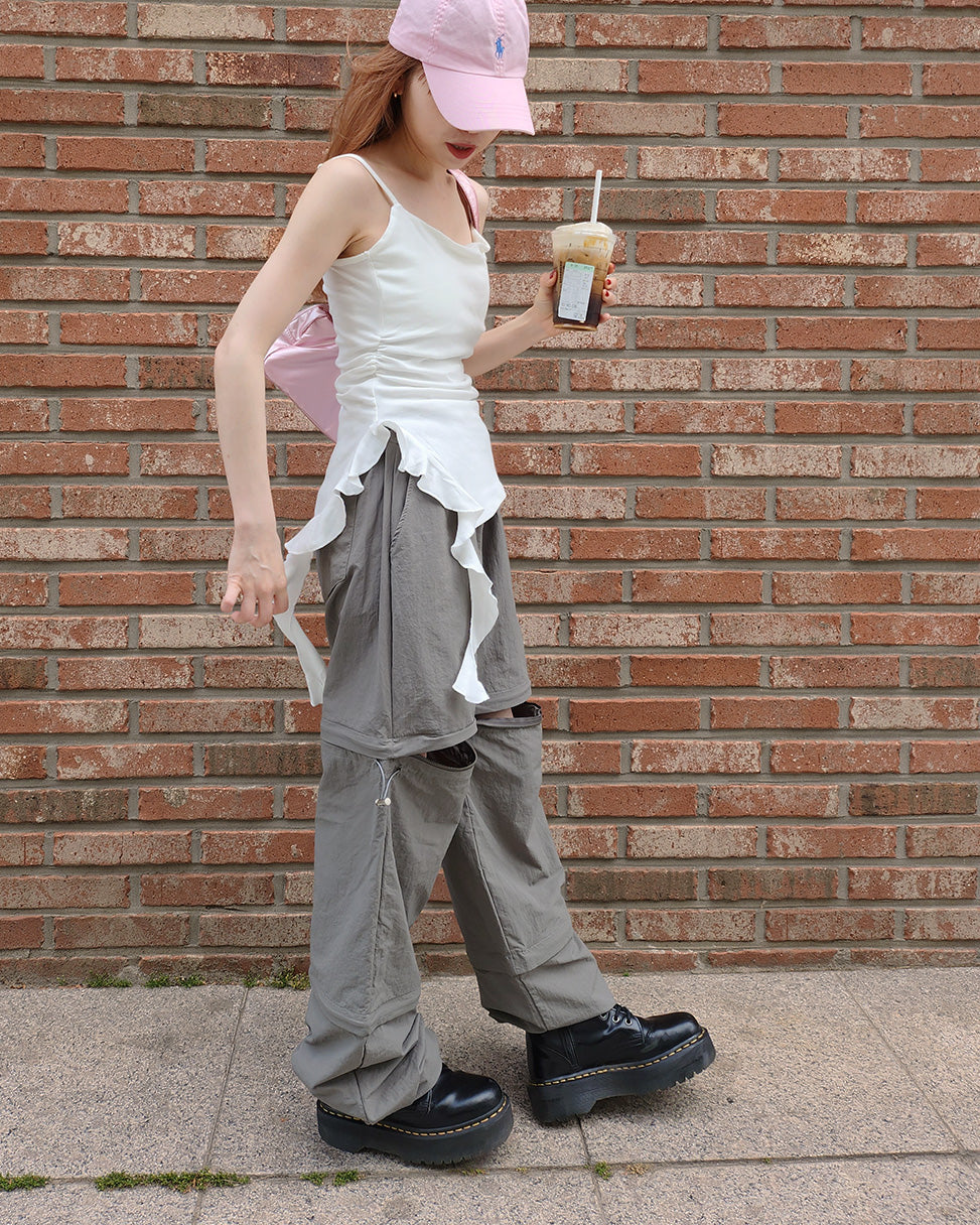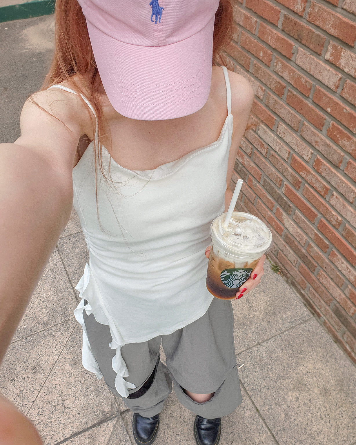アシンメトリーな裾とフリルが特徴のキャミソール。