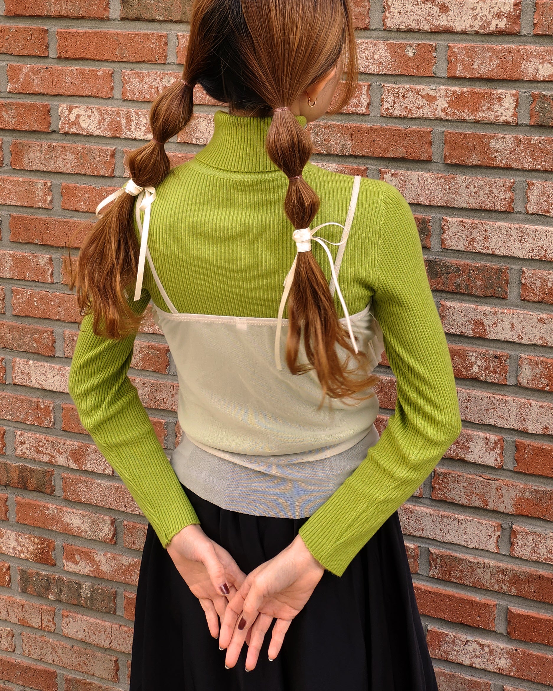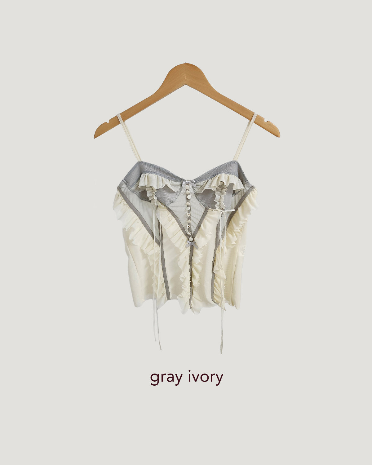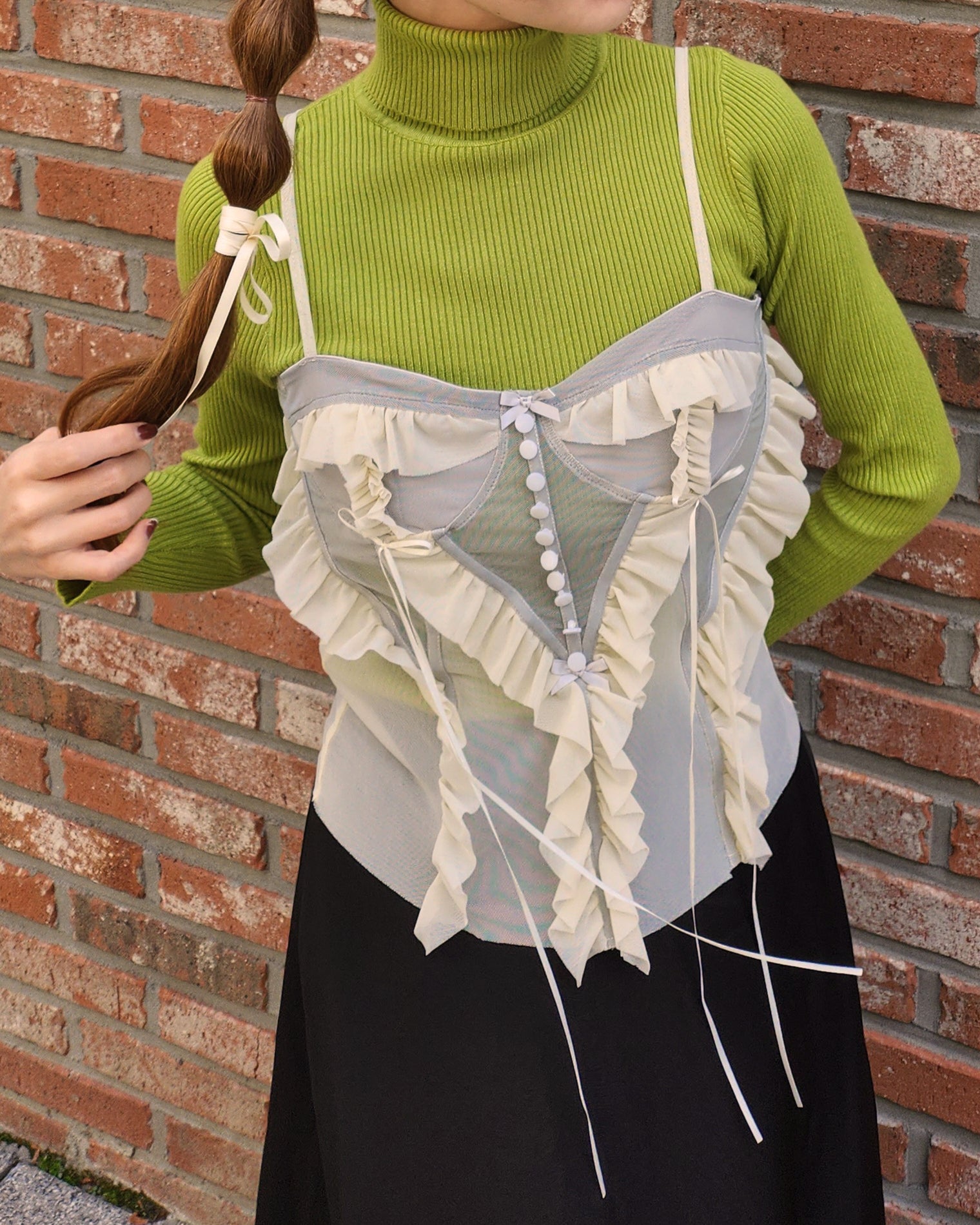 シアー感とたっぷりとあしらったフリルがポイントのビスチェ。