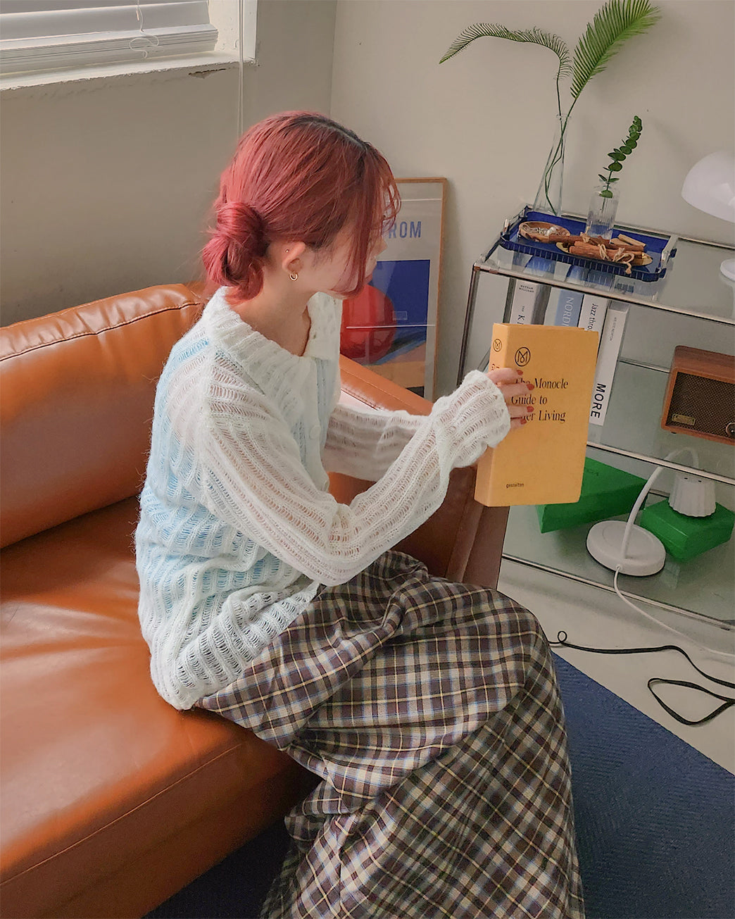 ざっくりとしたローゲージ編みのシアー感が個性的なニット素材のシャツ。